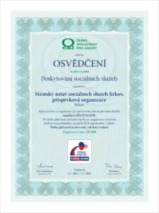 Nositelem certifikátu je v MěÚSS Domov se zvláštním režimem. Certifikát se obhajuje vždy 1x za 2 roky. Aktuálně máme platný certifikát do října 2025