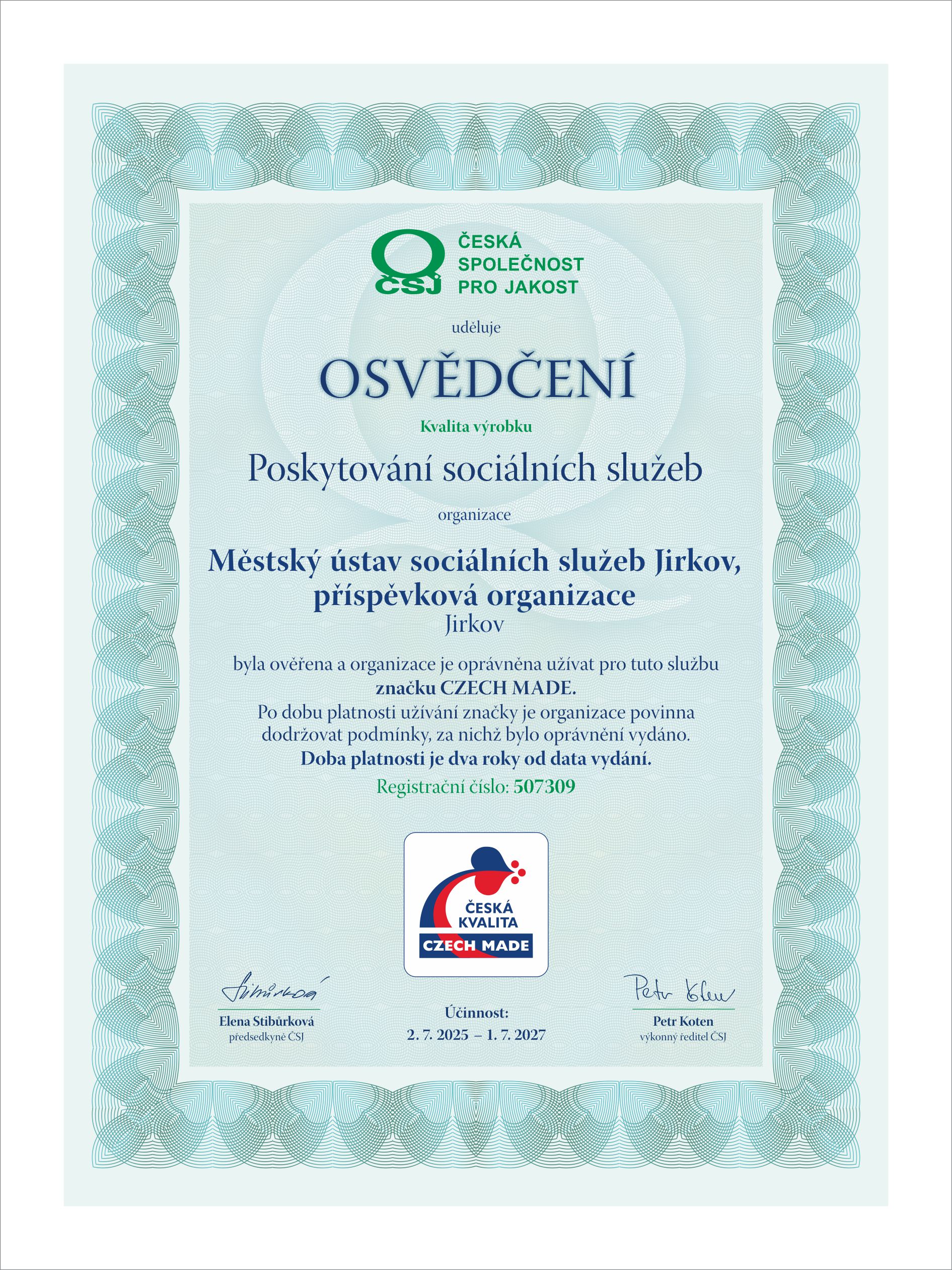 Audit v našem zařízení byl realizován na službě Domov pro osoby se zdravotním postižením. Platnost certifikátu je od července 2025 do července 2027.