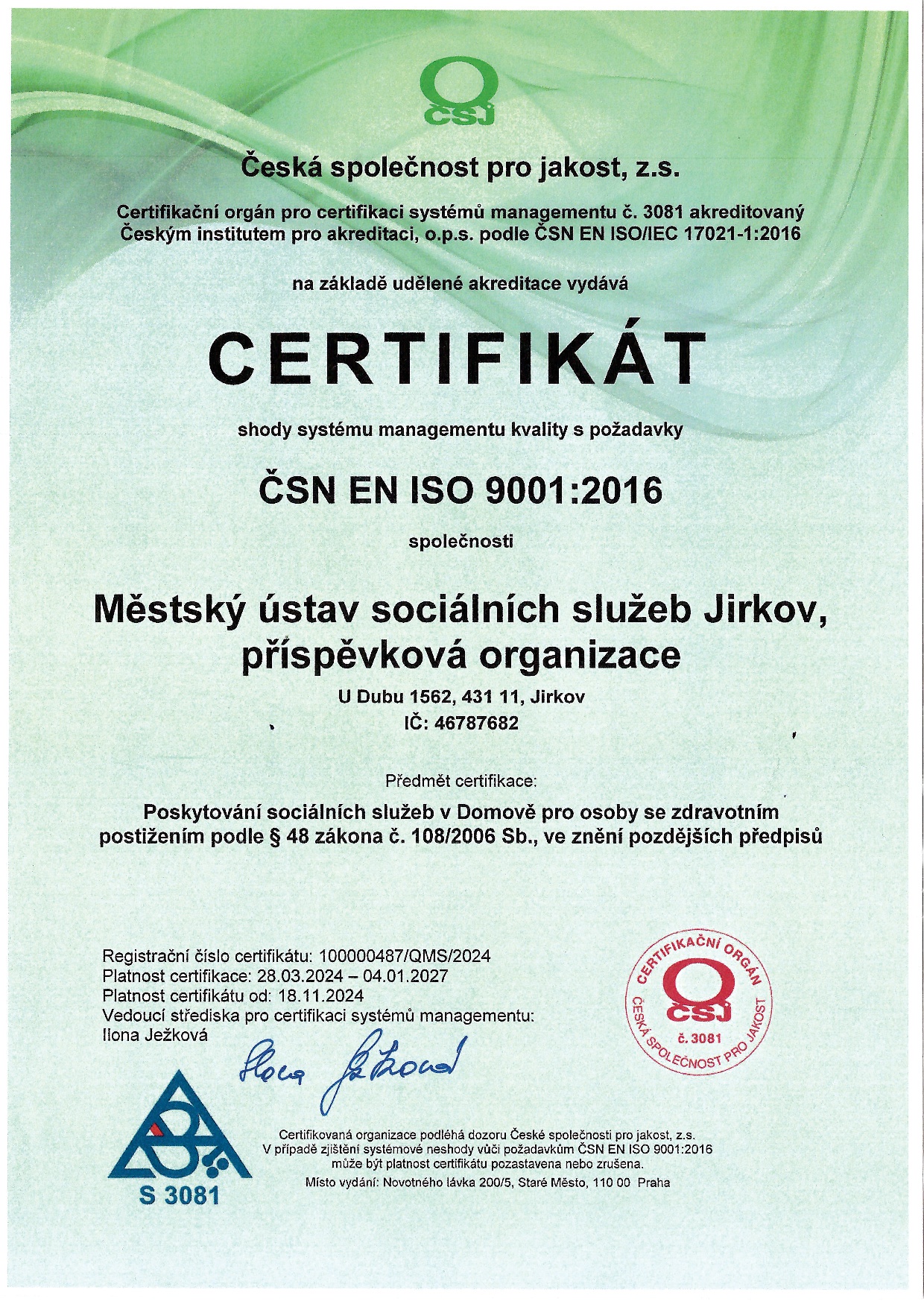 ISO 9001 jako mezinárodní značka kvality potvrzuje, že poskytujeme služby, které splňují očekávání zákazníků/klientů a jejich blízkých a jsou v souladu s příslušnými požadavky právních předpisů ČR a EU. Tento systém kvality garantuje našim dodavatelům, donátorům i zřizovateli, že jsme stabilní a konkurenceschopný střední podnik z hlediska řízení procesů. Zabývá se řízením zdrojů: lidských, finančních i materiálních, souladem s platnou legislativou včetně legislativy zaměřené na BOZP/PO/životní prostředí, metrologii, společenskou odpovědnost i ochranu osobních a citlivých údajů, whistleblowing. Jsme organizací oprávněnou účastnit se veřejných zakázek, a to i mezinárodního charakteru. V praxi to znamená, že jsme kromě státních a veřejných kontrol neustále pod ˶drobnohledem˝ svých zákazníků, spolupracovníků i kontrolního úřadu, který nám ISO vydal.
